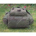 Moving to the back, the Rucksack features an upper nylon envelope panel constructed from a reinforced semi-circular webbing band and matching fabric body. At the top of this envelope are two small holes designed for the GS Pack Frame’s shoulder-strap loops to pass through when the frame is fitted. The lower half of the envelope carries a white cotton ID panel sewn directly to the back face. Below this are two angled closed-cell foam pads housed in nylon pockets, with a larger rectangular pad beneath them, all providing comfort whether the Rucksack is used with or without the frame. The lower corners include reinforced nylon D-rings for anchoring the shoulder-strap adjustment straps and securing the pack to the GS Frame with short nylon straps or para cord.