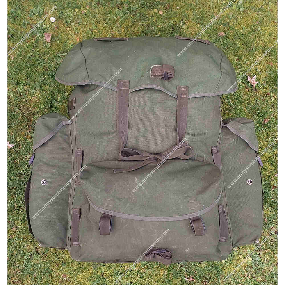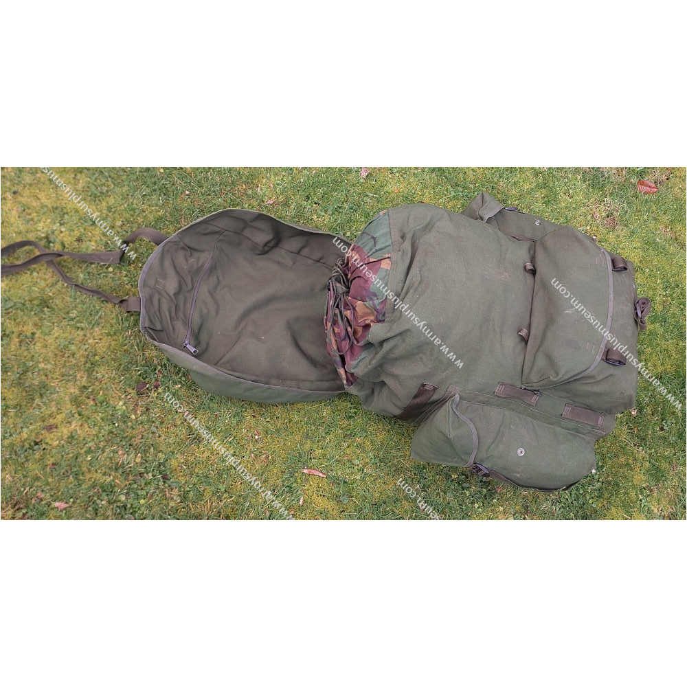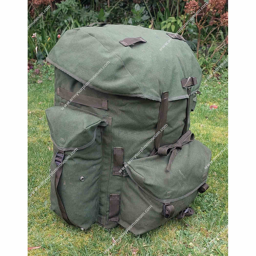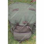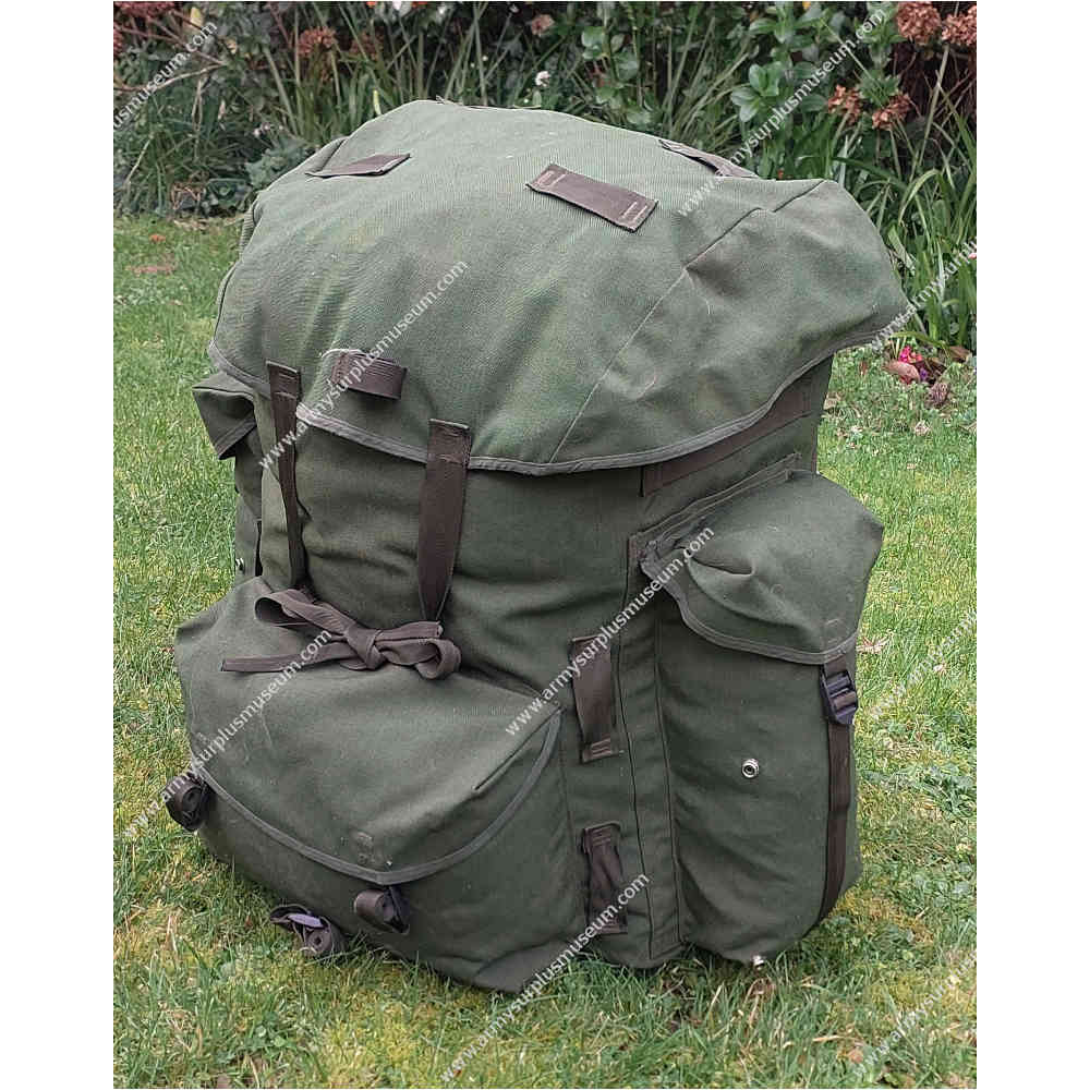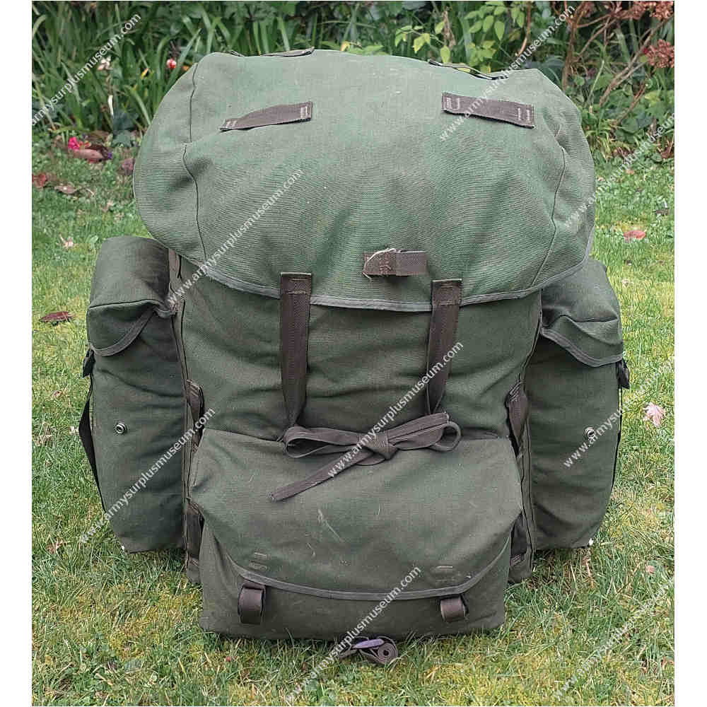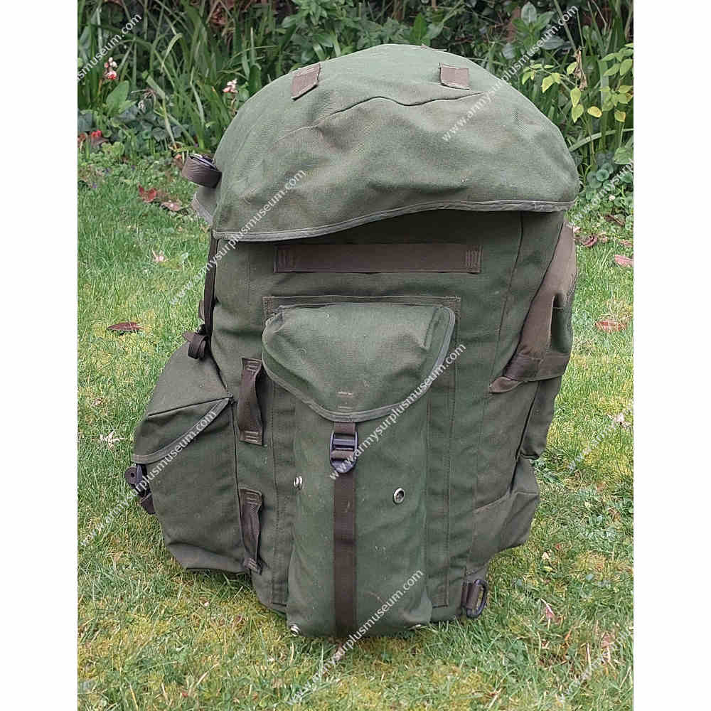 The Rucksack is fabricated from olive-green Cordura nylon and fitted with plastic D-rings and ladder-lock buckles throughout. The Rucksack features a flat nylon lid with short sides, closing securely over the main compartment with two long 25-mm webbing straps and ladder-lock buckles. The top of the lid includes four 25-mm webbing loops for attaching external items, while the underside houses a full-length flat ‘map’ pocket closed along the front edge with a nylon zip. Between the two lid straps is a horizontal 25-mm webbing entrenching-tool strap for additional carriage flexibility.