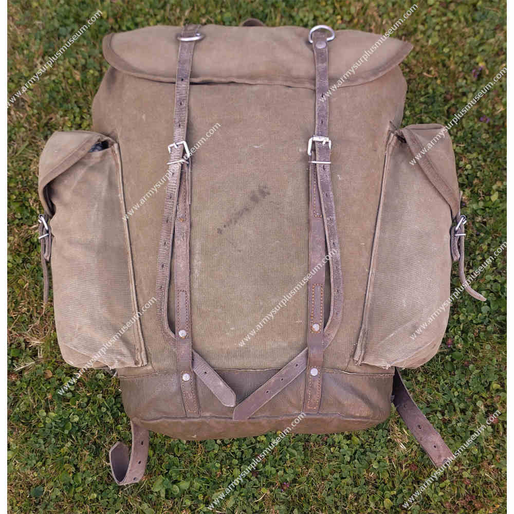 Originally produced in canvas with leather straps and metal fittings, the pack was later updated as Bundeswehr load-bearing equipment modernized. Around 2000, production shifted to stone-grey textured nylon with nylon straps and plastic buckles, aligning the pack with the new webbing system then being adopted across the army.