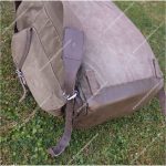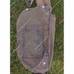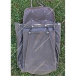 The pack is carried on wide, adjustable shoulder straps sewn to the top and reinforced with a webbing section. At the base of the back are vertical loops on either side, designed to take a 1-inch webbing strap for use as a waist belt. In later production versions, this strap was threaded through ladder-lock buckles fitted just below the shoulder straps.