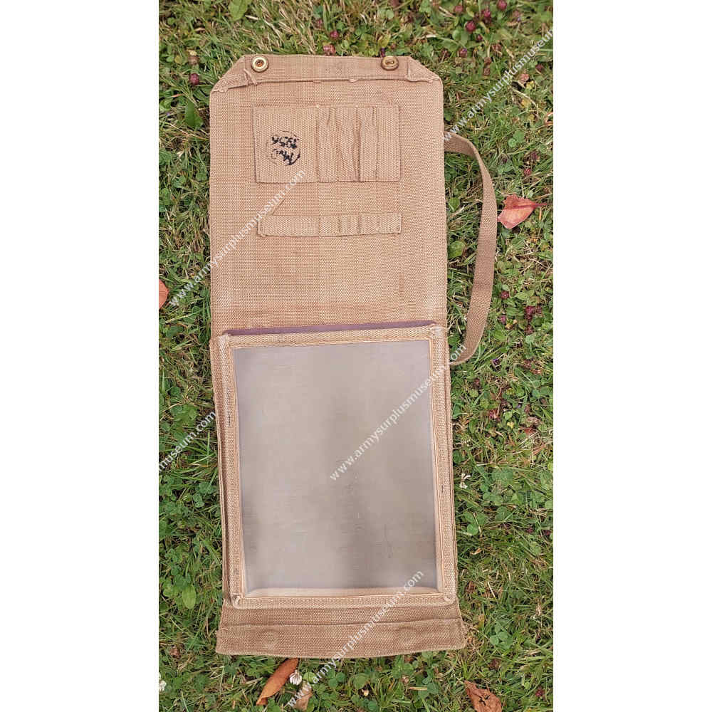 The case is fabricated from woven khaki webbing and forms a large rectangular pouch with an open-top internal compartment. The front of the pouch incorporates a full-width transparent celluloid window, allowing map details to be viewed and annotated externally without marking the map itself.
