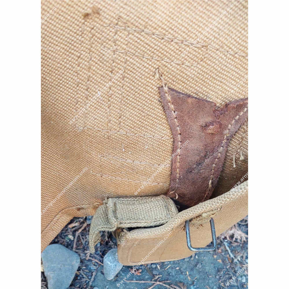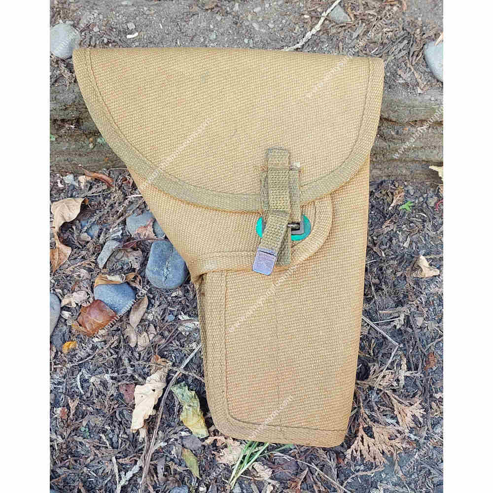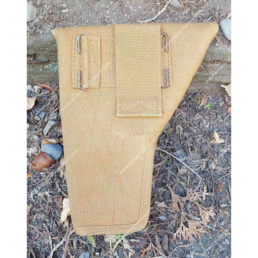 The holster is fabricated from thick, densely woven tan cotton webbing and is configured for right-hand use. The lid is cut wide at the top to fully cover the pistol grip and closes by means of a webbing pull-tab fitted with a metal D-ring, which engages with a metal staple mounted to the front of the holster body.