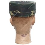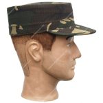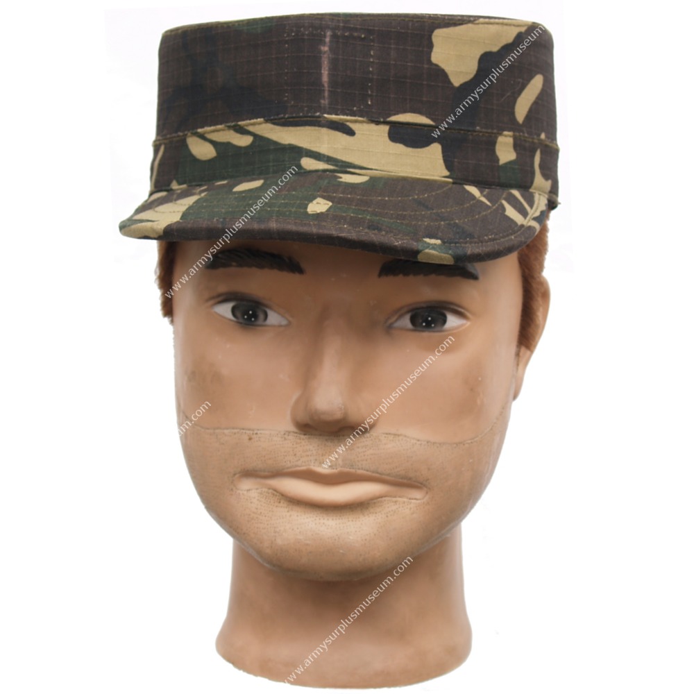 The cap is fabricated from a polyester-and-nylon blended cloth featuring a dark woodland-style camouflage pattern printed on the exterior. A 2.5 cm-wide cloth band is sewn around the base of the crown. The cap has a flat top, and the sides are extended and reinforced with a 0.5 cm-thick layer of closed-cell foam rubber. This internal foam lining provides structure—approximately 7 cm high at the front and 8 cm high at the rear—and is covered internally with matching camouflage fabric.